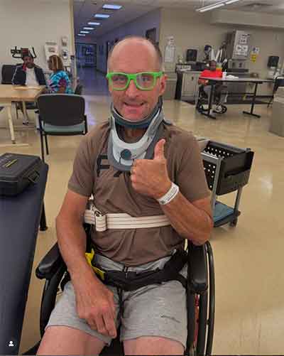 Mike is currently undergoing an intense schedule of four hours a day of physical and occupational therapy. One of the biggest challenges ahead is learning to walk again. At this time, he cannot walk without assistance and relies on a walker for support. His balance remains a major hurdle, and he continues to work hard every day to regain his strength and mobility.