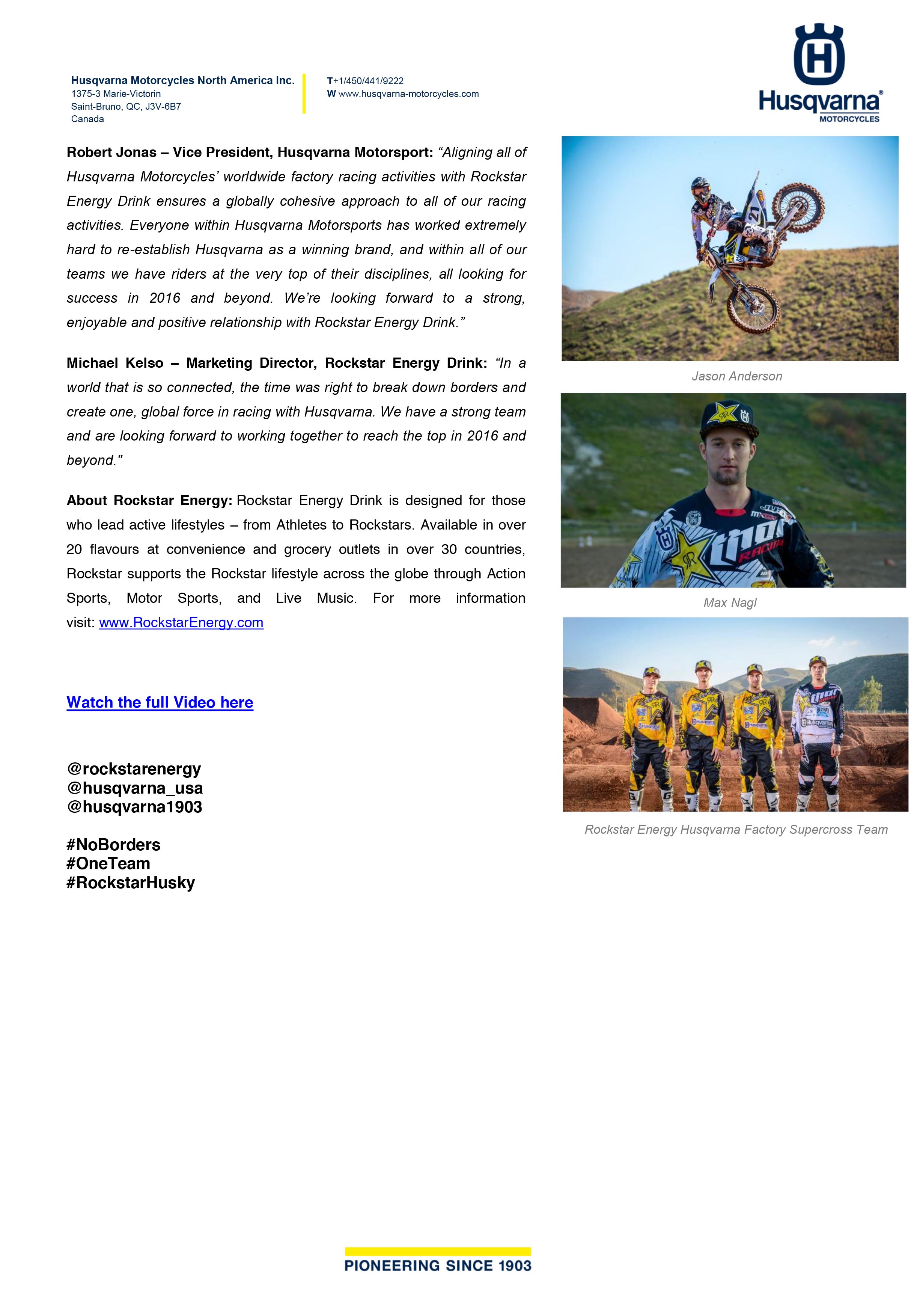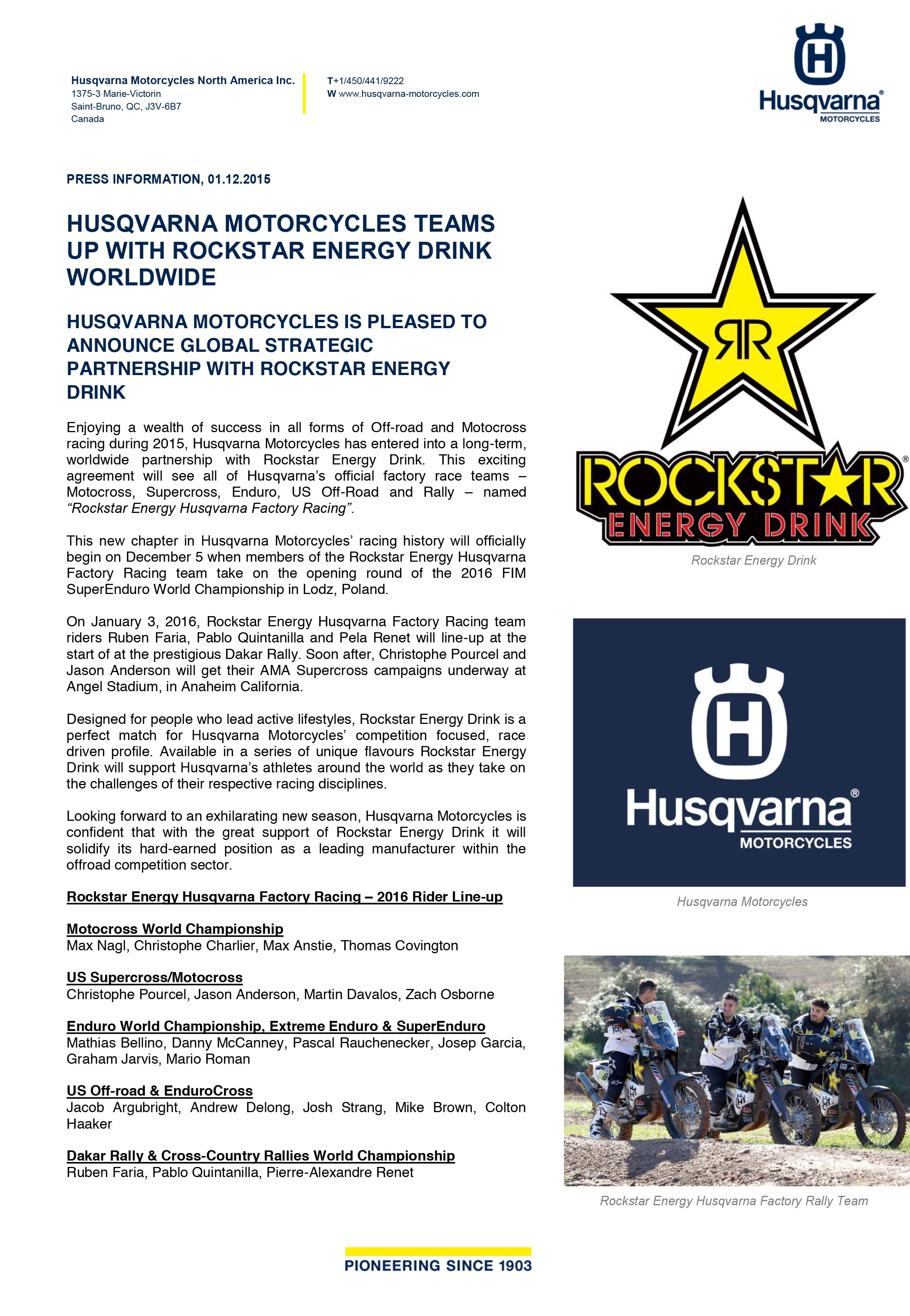Husqvarna Motorcycle Teams Up with Rockstar Energy Drink Worldwide December 02, 2015 Latest News, Press Release Bigwave Tagged HusqvarnaPress ReleaseRockstar Energy About author Bigwave View all posts