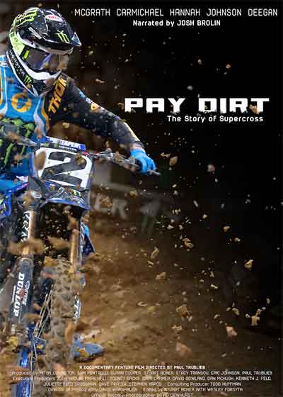 Narrated by Josh Brolin and directed by two-time Emmy-winning filmmaker Paul Taublieb, Pay Dirt captures the essence of the sport where passion meets commitment, relying on the twin pillars of cinematic camera work and deep archival research combined with in-depth interviews of Hall of Fame legends Jeremy McGrath, Bob Hannah, Ricky Johnson, and Ricky Carmichael.
